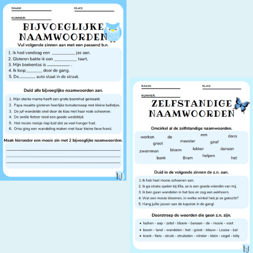 Enkele werkbladen waarmee bijvoeglijke en zelfstandige naamwoorden verder ingeoefend kunnen worden.